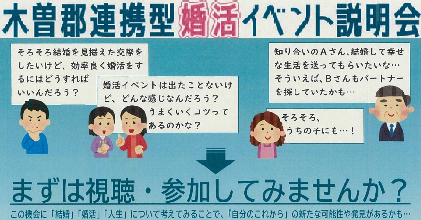 木曽地域6町村で連携を取り、「木曽広域自立圏連携ビジョン」内事業として結婚支援イベント(婚活イベント)やセミナーなどを開催しています。